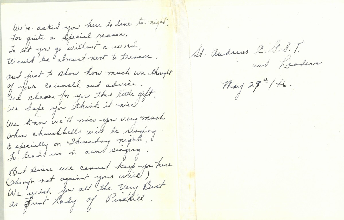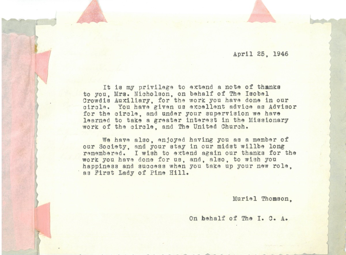 Less than 20 days until the official first day of spring! It’s been a long winter so I thought it might be nice to showcase these beautiful spring-themed cards. The homemade cards were given to Mrs. Nicholson on the occasion of her and her husband Rev. Nicholson leaving St. Andrew’s United Church in Sydney, Nova Scotia in 1946. Rev. Nicholson was leaving Sydney to become Principle and Professor of Theology of Pine Hill Divinity Hall, hence the reference to the “first lady of Pine Hill.”