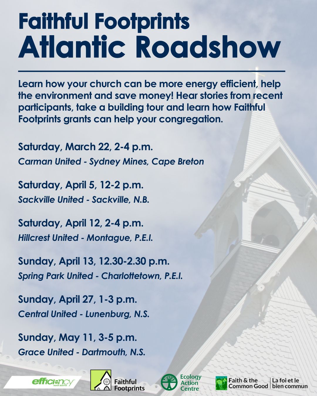 The Ecology Action Centre is doing a Roadshow across the Maritimes in the next 2 months to celebrate the many Atlantic churches who took part in the Faithful Footprint program and encourage other United Churches to apply for the grant. Our next stops are Montague PEI on April 12th, Charlottetown on April 13th, Lunenburg on April 27th, Dartmouth May 11th. The Faithful Footprint program is a grant program by the United Church to encourage United Churches to retrofit their buildings and help them to be more energy efficient and get off oil.