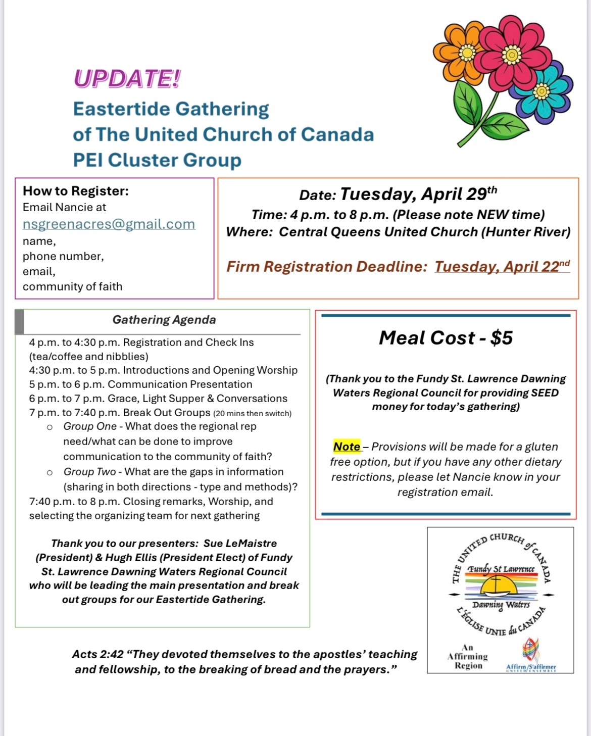 Charlottetown Sun., May 25th 1pm Spring Park United Church