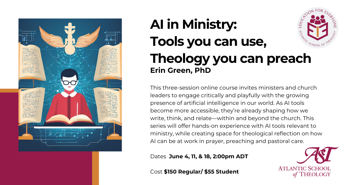 Join us for an exciting opportunity that will explore the use of AI as a ministry tool! Dr. Erin Green will lead this continuing education opportunity over three sessions: AI in Ministry: What it is and what it can do; Theological Reflection: What does AI mean for doing theology?; and Preaching the Present-Future: AI in the pulpit.