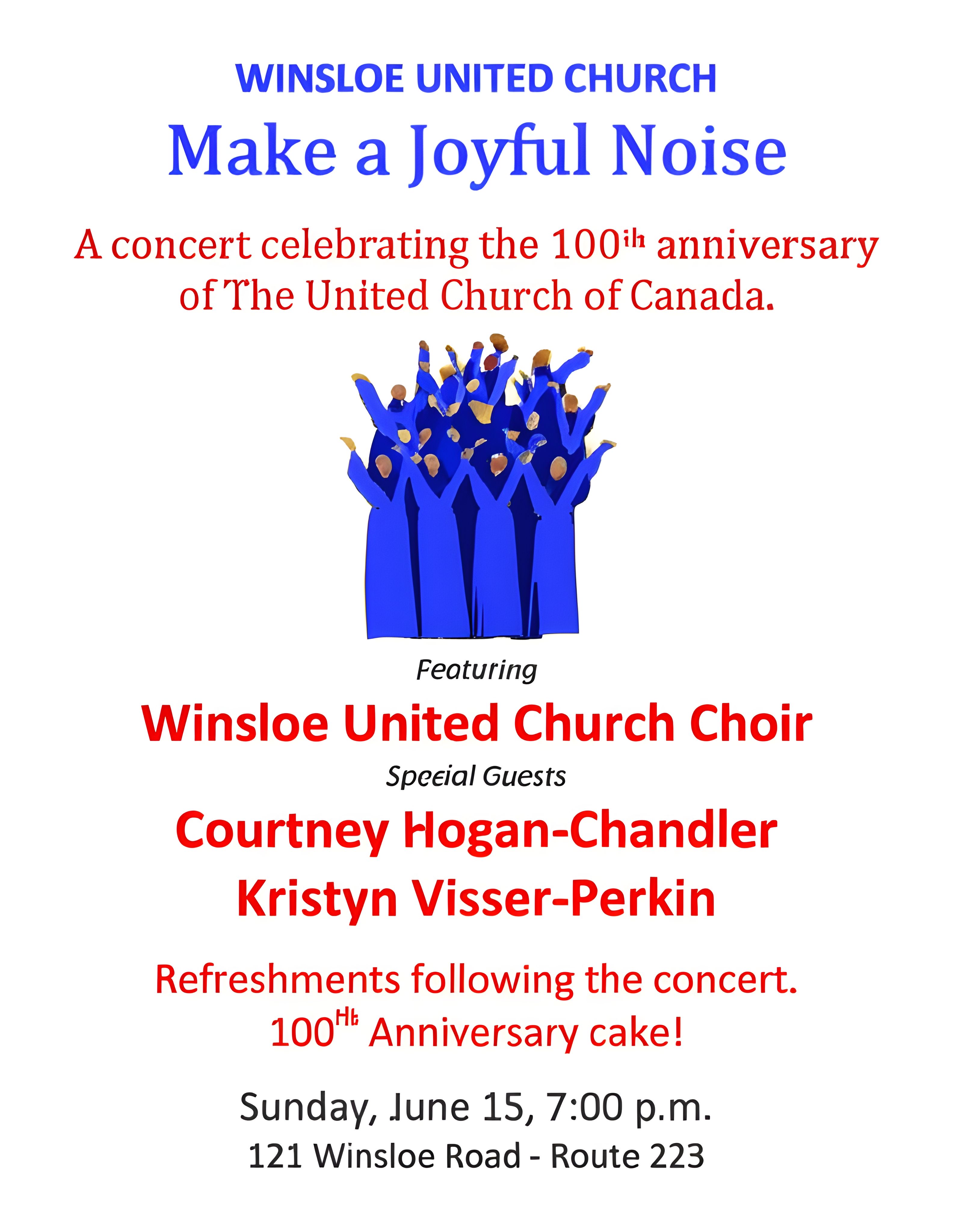 Winsloe United Church in PEI will be hosting a free concert the evening of June 15th as part of our 100th Anniversary celebrations, followed by a time of fellowship with Anniversary cake. The details are on the attached poster.