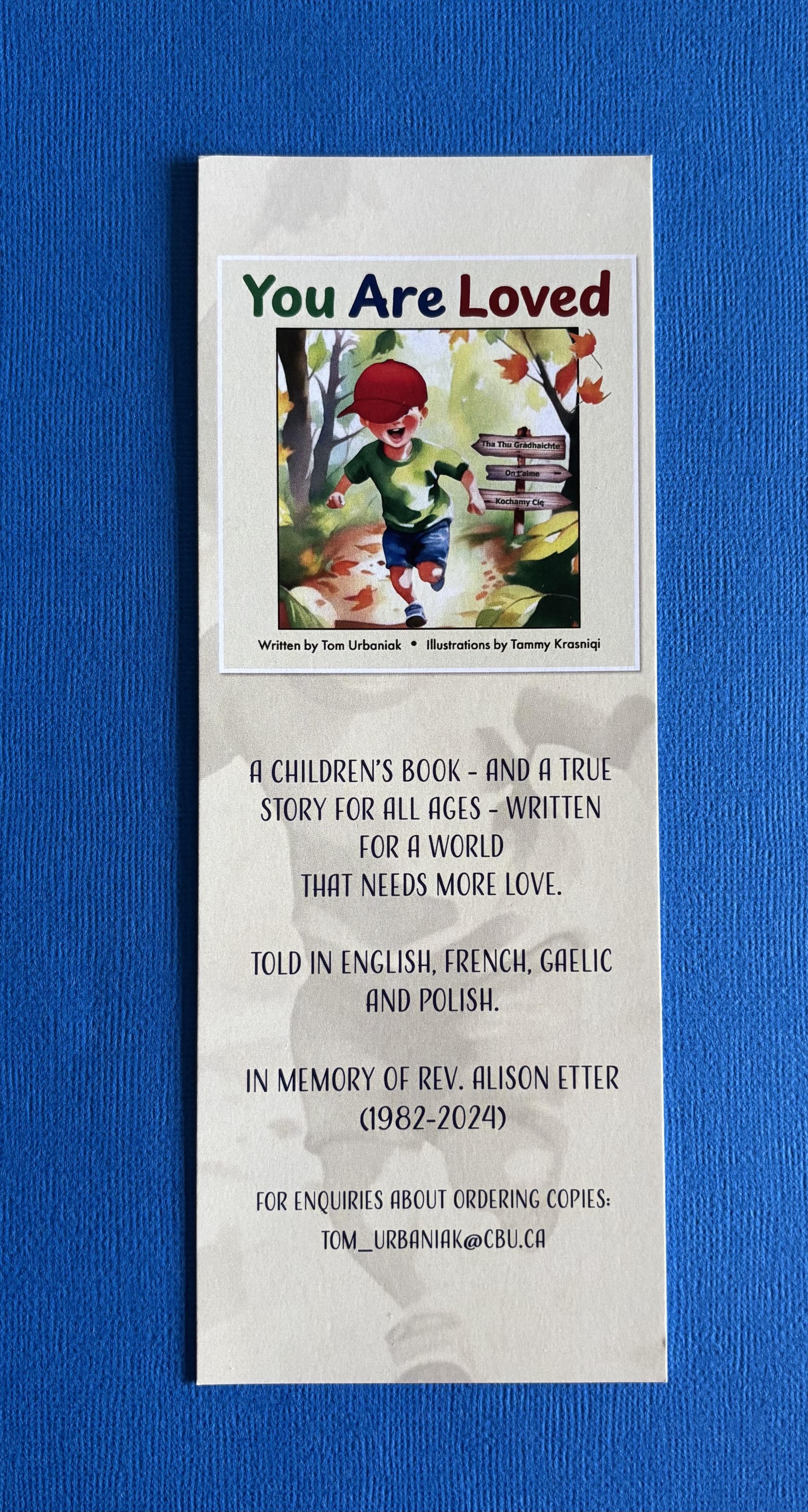 Copies of You Are Loved will be available for purchase, with all royalties donated to the Rev. Alison Etter Memorial Fund at the Atlantic School of Theology, supporting those who carry forward Alison’s work and values, across all faith traditions.