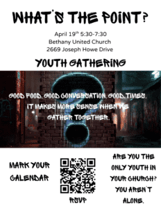 The group creates an inclusive, diverse and safe community for youth in the name of Christ. We provide a place for youth to explore their faith and to learn more about the United Church of Canada while sharing in music, worship and fun in a spirit-filled community.